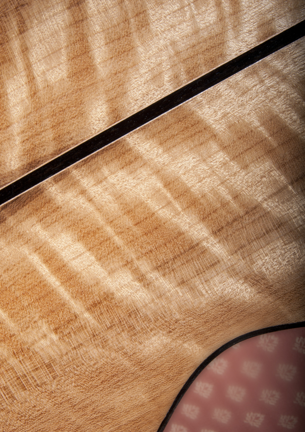 It comes standard with a Solid Special high flame Oregon Myrtle back and sides,Englemann spruce top with black/white herringbone rosette. Five piece maple/mahogany dovetail neck, scale length 24 7/8” with slotted headstock. West African ebony fingerboard (paua abalone fret dots), bindings, heelcap and bridge. Rosewood headstock veneer (maple insert). Bracing Sitka spruce, kerfing spruce/mahogany. Bone nut and saddle.
