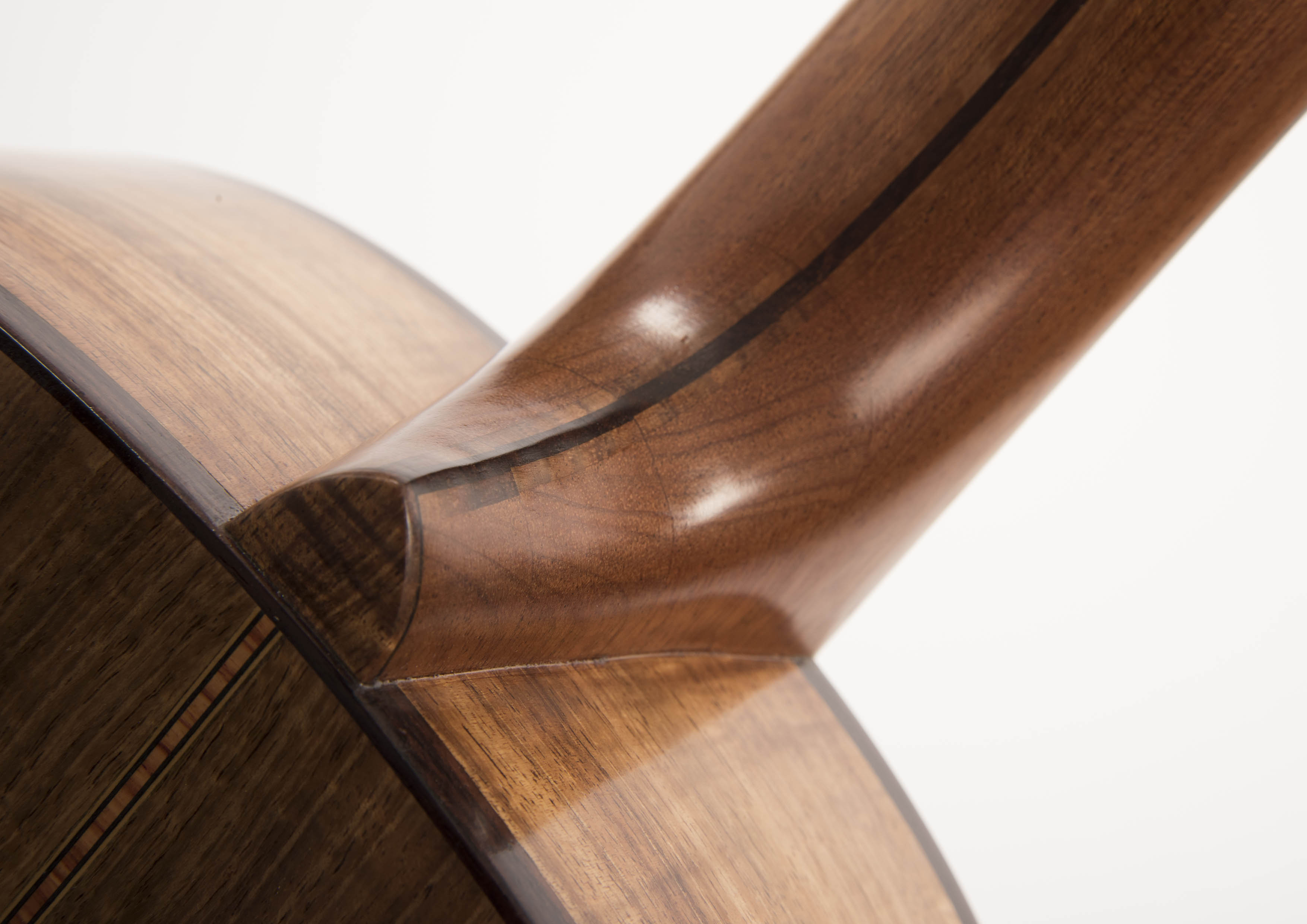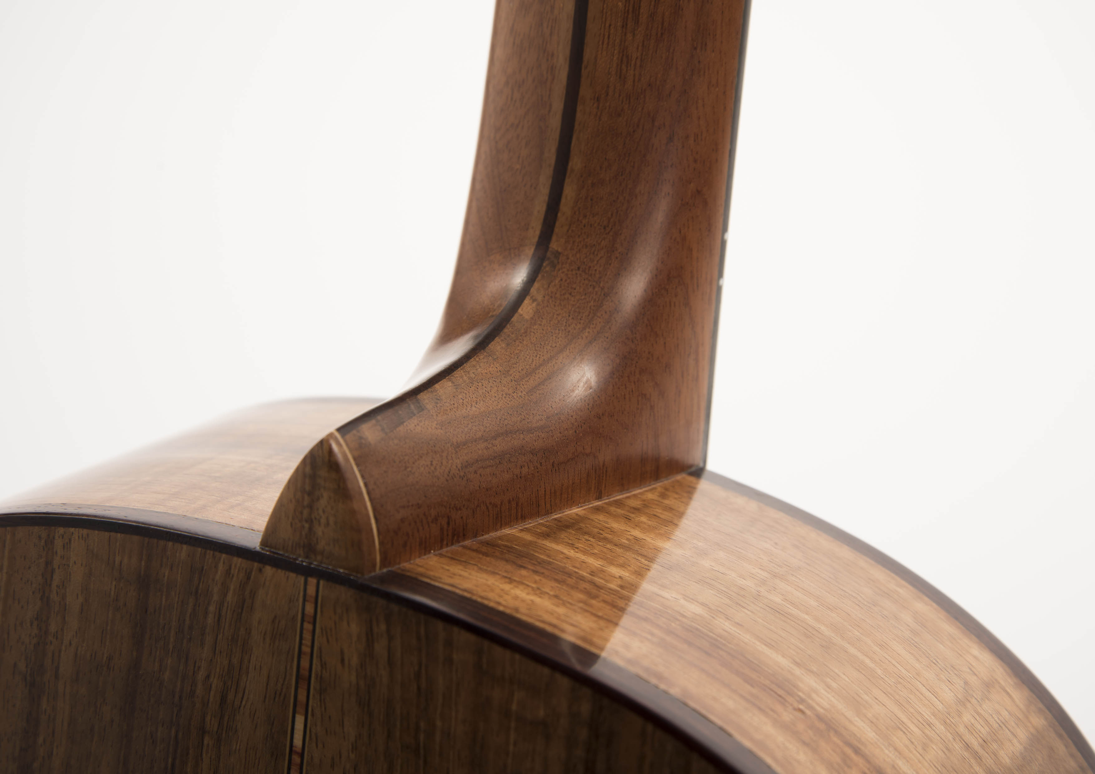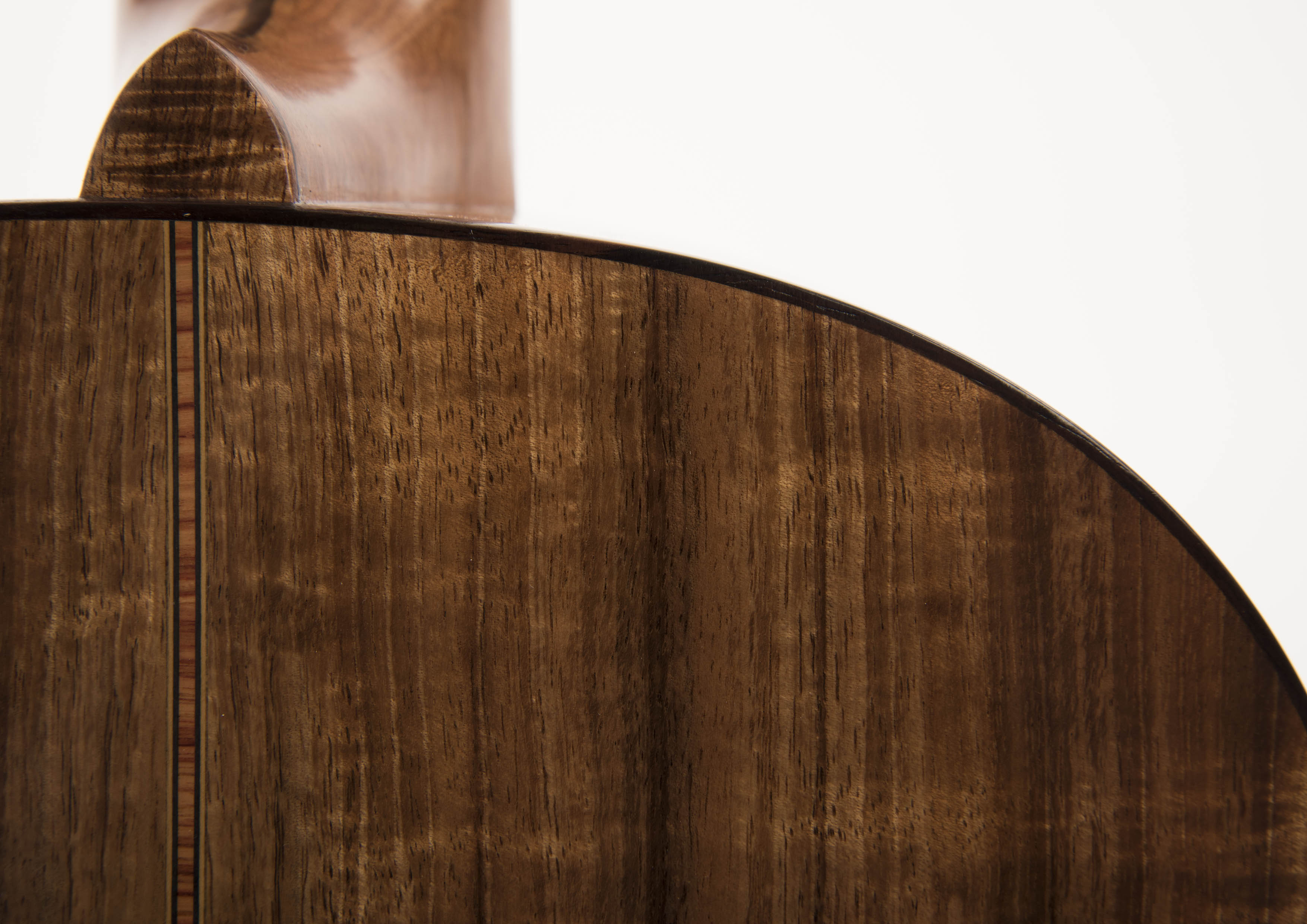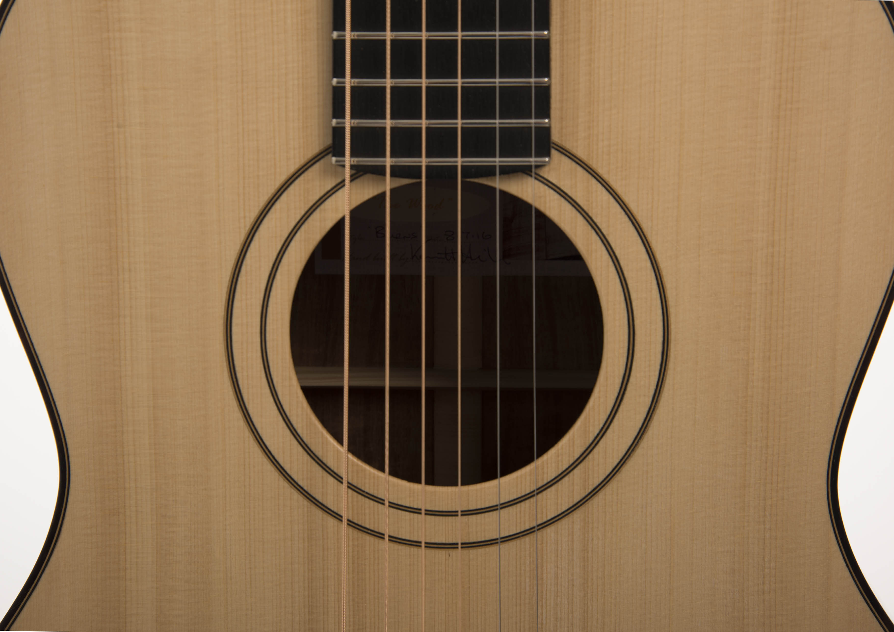 We decided upon the “Burns” body size but made some subtle changes to my standard model. We went for Adirondack Spruce tops coupled with Tasmanian Blackwood back and sides, a five piece neck and a hybrid bracing system on the soundboards. The depth of the body was also increased slightly as well as a larger sound-hole to match.
